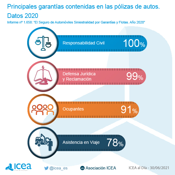 La mayoría de pólizas de seguros de automóviles que se vendieron en 2020 incorporan las garantías de Responsabilidad Civil (el 100% de las mismas) y Defensa Jurídica (99%) y, en menor medida, la de Ocupantes (con una cuota del 91%), según datos publicados por ICEA.